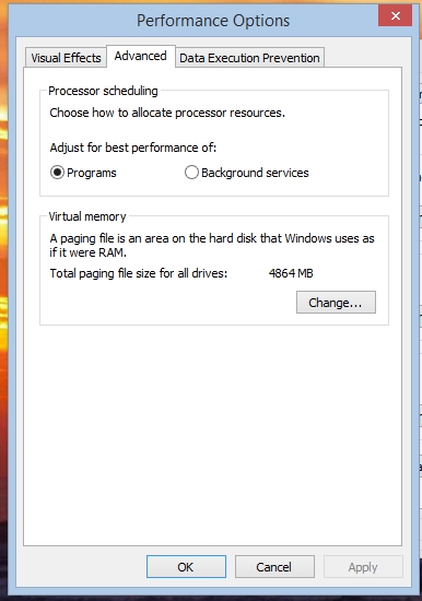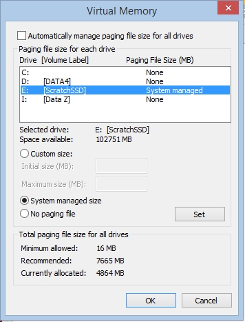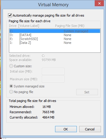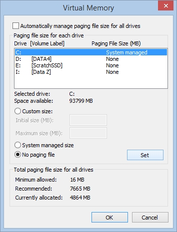 Uncheck AUTOMATICALLY MANAGE PAGING FILE SIZE FOR ALL DRIVES