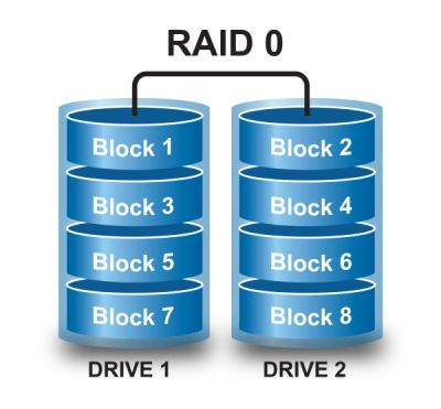 RAID 0 comprises striping. This level provides no data redundancy but improves performance through parallelism of read and write operations across multiple drives. RAID 0 has no error detection mechanism, so the failure of one disk causes the loss of all data on the array. Generally you could almost double the speed of read & write operations using RAID 0, but this has almost become obsolete with the introduction of SSD (Solid State Disk) drives which run at 3 or 4 times faster that the standard Hard Disk Drive.
