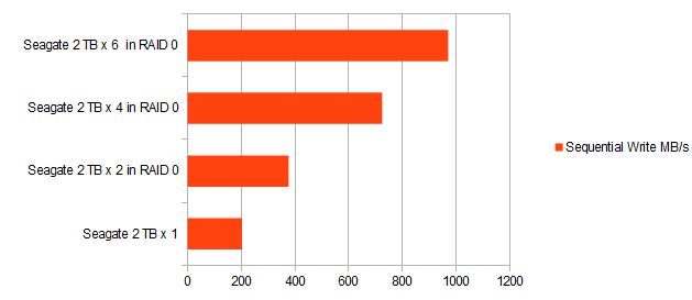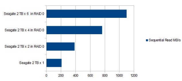 Below are the results from using CrystalDiskMark 5.1.2 x64 on various numbers of Seagate 2Terrabyte drives.