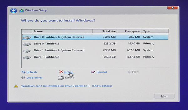 We are going to delete all the partitions on Drive 0 only in this example. If you have 2 hard drives you may wish to keep all the data on the 2nd hard drive and therefore you need only to delete the partitions on Drive 0 while keeping Drive 1 as it is.